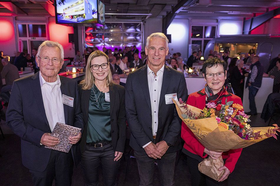 Die alte und die neue Generation stellte sich während der 80-Jahr-Feier zum Gruppenfoto auf: Klaus P. Scholl (l.) und Margret Schilling-Scholl (r.) sind seit diesem Jahr im Ruhestand. Nun leiten Markus Müller und Stefanie Scholl als geschäftsführende Gesellschafter das Unternehmen. Foto: Scholl