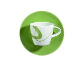 Die zweite Dekoridee Modern Flower in den Farben Beige und Aubergine setzt auf spiralförmige Linien, die eine Blume formen. Das ausdrucksstarke Dekor deutet die florale Struktur indes nur an. Besonders raffiniert ist dabei die Variante dieser Dekoridee, bei der die „moderne Blume“ mit den Wörtern „Cappuccino“, „Coffee“ und „Espresso“ verbunden wird. Aus den Wort- und Bild-Elementen entsteht eine grafische Einheit, die mit dem farbigen Fahnenfond der Untertassen wunderbar harmoniert.