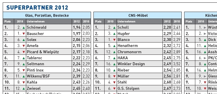 In der Kategorie CNS-Möbel mit 16 Unternehmen gelangte die Scholl Apparatebau nach einem kleinen Aussetzer vor zwei Jahren wieder auf den ersten Platz. Von Platz 3 auf Platz 2 konnte sich Hupfer verbessern und verwies den vorigen Gewinner Blanco CS auf Platz 3. Die Firma Klaus Großküchen wurde zwar als beste beurteilt; da aber insgesamt zu wenige Beurteilungen vorlagen, konnte das Unternehmen nicht bewertet werden. Insgesamt wurden in dieser Kategorie 15 Unternehmen mit durchschnittlich 2,53 bewertet. Damit wurden diese Lieferanten deutlich besser beurteilt als 2010.