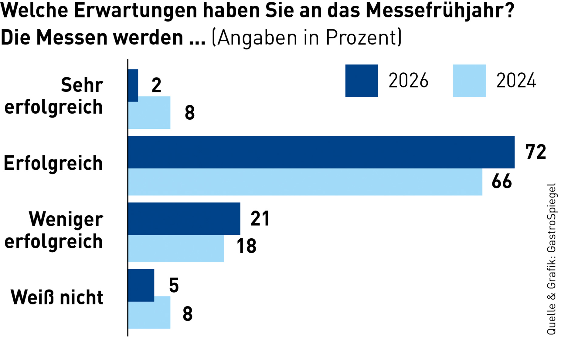 Wie im Zweijahresrhythmus üblich, hat GastroSpiegel bei den Lieferanten des Fachhandels wieder nach den Erwartungen an das Messefrühjahr gefragt. Erstaunlich ist, dass sich die Ergebnisse nicht wesentlich von der letzten Umfrage unterscheiden. Insgesamt erwarten 74 Prozent einen positiven Verlauf (2 % sehr erfolgreich), was genau dem Wert von vor zwei Jahren (66 %/8 %) entspricht. Dass 21 Prozent weniger erfolgreiche Fachmessen erwarten und acht Prozent die Situation nicht einschätzen können (gesamt 26 %, ebenfalls der gleiche Wert wie 2024), zeigt die erneut unsichere wirtschaftliche Lage in Deutschland.