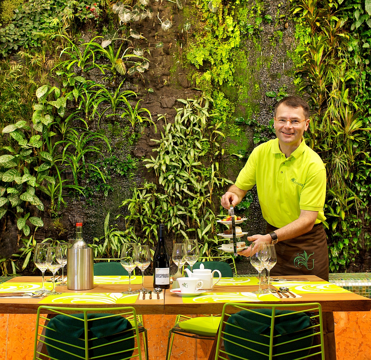 GastroSpiegel, 02.01.2013 – Das neue Restaurant liegt im Dussmann-Haus direkt am vertikalen Garten, einer 270 Quadratmeter großen Wand mit mehr als 6.000 blühenden tropischen Pflanzen. Der vertikale Garten soll die nachhaltige Ausrichtung der Dussmann Gruppe in den Bereichen Ökonomie, Ökologie und Soziales symbolisieren. Die Inneneinrichtung sorgt für ein stimmiges Ambiente: dunkles Holz, Sisal-Sessel und Ledersofas in warmen Tönen. Hellgrüne Farbpunkte werden durch die Stühle und Bekleidung des Servicepersonals gesetzt. Die Atmosphäre des Restaurants ist außergewöhnlich und gemütlich. Eine Berliner Tischlerei fertigte aus einer einzigen Berliner Kernbuche die Tische. Das Holz für die Barhocker ist FSC-zertifiziert und mit Biofa-Öl behandelt.