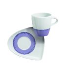 Die zweite Dekoridee Modern Flower in den Farben Beige und Aubergine setzt auf spiralförmige Linien, die eine Blume formen. Das ausdrucksstarke Dekor deutet die florale Struktur indes nur an. Besonders raffiniert ist dabei die Variante dieser Dekoridee, bei der die „moderne Blume“ mit den Wörtern „Cappuccino“, „Coffee“ und „Espresso“ verbunden wird. Aus den Wort- und Bild-Elementen entsteht eine grafische Einheit, die mit dem farbigen Fahnenfond der Untertassen wunderbar harmoniert.