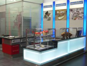 Ein weiteres Highlight ist ein exquisiter Kochblock in Sonderbauvariante. In die Abdeckung aus Granit eingebaut sind: ein Glaskeramikherd, ein Induktions-Wok, ein Pastakocher, ein Elektro-Rostgrill und ein Elektrobratplatte aus der qualitativ hochwertigen und flexiblen Produktserie Integraline-Einbaugeräte. Der Korpus des Kochblockes ist aus Edelstahl und rot pulverbeschichtet. Weiterhin zeigt Ascobloc modulare Geräte aus der Kochgeräteserie Ascoline 700 und einen funktionsbereiten Getränketresen mit Zapfarmatur, Tropfmulde und Schrankfach für Bierfässer.