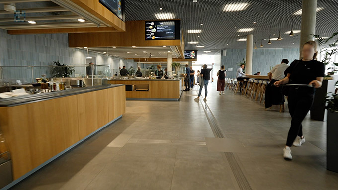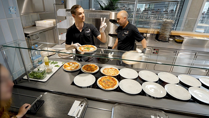 Die Rüstküche ist hoch-kompakt gebaut, auf nur 50 Quadratmeter bereitet hier das Küchenteam für 1.000 Gäste im Mittagsgeschäft alles vor. An den Countern wird vor dem Gast ab 11.30 Uhr „gefinished“. „Der Gast muss hier nur einen Counter ansteuern und erhält dann alles, neben dem Hauptgang auch Dessert, Salat, Tablett, Besteck, kann auch zahlen“, erläutert Peter Adam-Luketic von Vtechnik Planung. „Das bringt mehr Ruhe in den Gastraum, der Mensa-Look verschwindet und es ist natürlich service-orientierter“, ergänzet der Fachplaner.