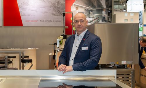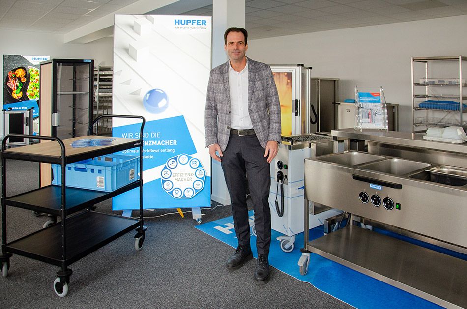 Marc Reichling, Geschäftsführer Hupfer, zeigt im Showroom in Coesfeld, dass der Hersteller inzwischen in allen Segmenten des Gastgewerbes als „Effizienzmacher“ aktiv ist. Die Intergastra in Stuttgart habe die Strategie bestätigt, betont der Branchenkenner. Foto: Lang (2)